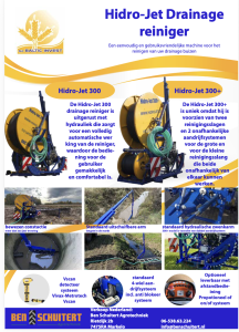 De spoelslang wordt volledig hydraulisch aangestuurd, met mogelijkheid tot hydraulische hoogte- en lengteverstelling. De Hidrojet drainagereiniger is standaard voorzien van een zwenkarm die hydraulisch regelbaar is. De standaard spoelslang heeft een lengte van 300 meter, maar kan worden uitgebreid naar 400 of 500 meter.